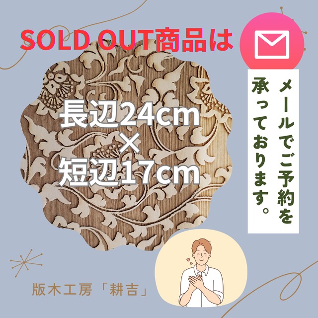 ネットショップ開設以来、度々SOLD OUTとなりまして、ご希望のお客様には大変お待たせしております。 合格した原木の入手が一時困難となっておりましたが、現在は一定の在庫を確保できるようになりました。 原木入手後は一つひとつ丁寧な職人仕事で仕上げております。 耕吉の版木商品は「受注生産」が基本のため、ネットショップの在庫が少なく度々SOLD OUTが発生してしまいます。どうかご容赦ください。 SOLD OUT商品につきましては、版木工房「耕吉」メールアドレス [email protected] または、このサイトのCONTACTより お気軽にお問合せくださいませ。 商品のお届けまで1カ月程お待ちいただきますが、ご予約承っております。 どうぞよろしくお願いいたします。 版木工房 耕吉